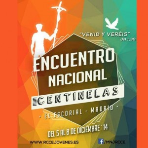 Eventos anteriores Encuentro Nacional de Centinelas (El Escorial – Madrid) 08/11/201413/12/2014 ministeriTIC «Venid y veréis» (Jn 1,39) Lugar de celebración: El Escorial – Madrid Horario: Del 5 al 8 de Diciembre Más información: https://www.facebook.com/mnjrcce http://on.fb.me/1tKZuo0 http://rccejovenes.es/